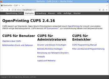 Webbasierte Konfigurations-Startseite von CUPS 2.4.16 in Firefox